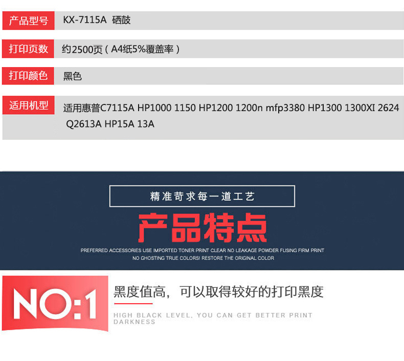 凱欣KX-C7115A 適用惠普C7115A硒鼓HP1000 1150 HP1200 1200n mfp3380 HP1300 1300XI 2624 Q2613A易加粉HP15A 13A硒鼓 全國統(tǒng)一價(jià):275元